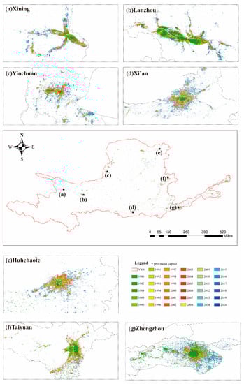 The time series of the creation of impervious surfaces in the Yellow River Basin (YRB) and seven provincial capital cities. Each color represents the year when a pixel changed from permeable to impervious surfaces from 1986 to 2020 (colors transition from shades of green to yellow, red, and blue over time): (a) Xining; (b) Lanzhou; (c) Yinchuan; (d) Xi’an; (e) Huhehaote; (f) Taiyuan; and (g) Zhengzhou.