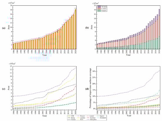 Annual impervious surfaces areas in (a) the Yellow River Basin (YRB); (b) western, central, and eastern parts of the YRB; and (c) seven provincial capital cities of Lanzhou, Xining, Xi’an, Yinchuan, Huhehaote, Taiyuan, and Zhengzhou; (d) percentage of impervious surface coverage within the above research units.