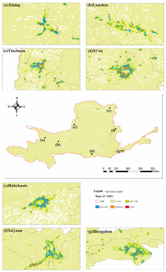 The interannual trends in changes of the impervious surfaces fraction in the Yellow River Basin (YRB) and the seven provincial capital cities analyzed here: (a) Xining; (b) Lanzhou (c) Yinchuan; (d) Xi’an; (e) Huhehaote; (f) Taiyuan; and (g) Zhengzhou.