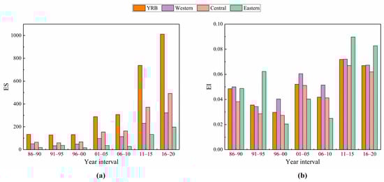 We analyzed the EIS at intervals of five years; the results are shown in Figure 8 and Tables S1 and S2. In Figure 8a, the values of ES in the YRB have obvious time differences, with step-like increases at the transformed points of 2000 and 2010. The results strongly confirm the description of the three growth stages described above in Section 3.2.1. The values of ES in the western and central parts of the YRB were basically in line with the stepped increasing trend, except in the Ordos (Table S1). However, the values of ES in the eastern areas increased suddenly after 2010, so this region doesn’t have the characteristic of having three distinct periods. Table S1 indicates that the values of ES in capital cities were usually higher than those in non-capital cities, reflecting the regional imbalance of urban development.