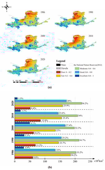 Levels of the remote sensing-based ecological index (RSEI) in the Yellow River Basin (YRB) for 1986, 1990, 2000, 2010, and 2020: (a) spatial distribution of RSEI results in each year; (b) statistic results of the area of RSEI.