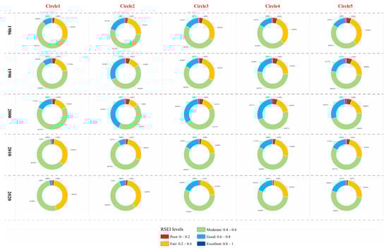 Combined with the distribution characteristics of the ISCR and RSEImean in Table 3, the proportion of the corresponding RSEI levels at time nodes of various circles were calculated (Figure 10). From the perspective of the time scale, the proportion of poor RSEI levels showed a trend of undulating decrease, especially in circle5 (5.2% in 1986, 6.15% in 1990, 5.59% in 2000, 3.92% in 2010, and 1.87% in 2020), while the other levels showed disparateness. The proportion of good and excellent RSEI levels form 1986 to 2020 observably decreased in circle1 and circle2 (10.88% to 3.3%, and 21.03% to 7.12%, respectively), and volatility increased beyond circle3 (17.05% to 18.57%, 15.9% to 19.19%, and 16.01% to 19.98%).
