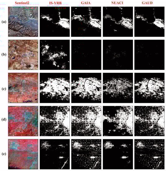 Combined with the previous introduction, IS-YRB was the supervised classification with post-classification processing, and NUACI was the threshold segmentation method based on a new index, while GAUD employed high precision auxiliary data incorporated with the NUACI algorithm and time-series segmentation. Although the NUACI algorithm took account of the differences in threshold values adopted in different areas, it was fragile in the face of the heterogeneity, which may be present within a few meters because of the complexity of the IS aggregation areas. The benchmark data in GAUD provide the guarantee of improved classification results; furthermore, change detection effectively solves the problems with the NUACI algorithm in heterogeneous regions. The scatter diagram in Figure S2 shows differences between the extraction results of NUACI and GAUD, and some points are even close to the X or Y axis. Likewise, contrastive diagrams of fitting lines between data before and after excluding villages and towns were drawn in Figure S1b. Figure S1b suggests that R2 and RMSE of the fitting lines between IS-YRB and NUACI both increased. Regarding the distribution in the scatterplots, many scattered points are far away from the fitting lines, even when the density of the impervious surfaces was greater than 0.5. Consequently, we can infer that NUACI not only missed small villages and roads but also had a large amount of error associated with urban areas having a high density of impervious surface pixels. The improved method—GAUD—had a good consistency with IS-YRB (Figure S1b), which means that the NUACI algorithm needs to be combined with some assistant methods to optimize the rough classification results (Figure 11c,d,e). In conclusion, the main reason for the difference between IS-YRB and NUACI was the classification error caused by the immature extraction process of the latter, while the good fitting between IS-YRB and GAUD proved that different time series data extraction methods were both reliable (the former is an annual classification plus post-classification processing method, while the latter was a base year interpretation plus change detection method).