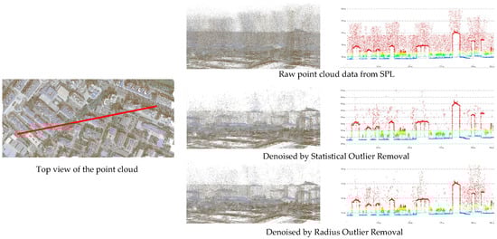 The basic idea of the statistical methods is to calculate the point numbers within each neighborhood or to calculate local point density to obtain a statistical histogram, and finally, distinguish between noisy and non-noisy points based on a threshold value. The basic idea of the priori knowledge-based methods is to apply morphological closing to remove the low outliers and to apply morphological opening to connect the isolated ground points. However, there will still be a large number of noise points in the SPL point clouds after denoising using traditional methods, and further denoising is inevitable. (Figure 1). Therefore, an effective SPL point cloud denoising method is urgently needed. There are also many other significant problems that have to be solved. Two of these problems are as follows: