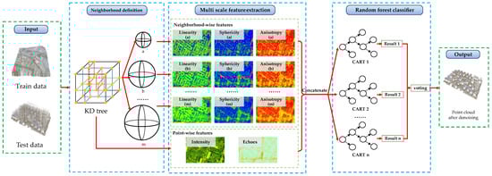 To resolve the problem that existing methods are not effective in removing SPL noise, we proposed a multistage denoising approach using a classifier trained based on multiscale features. The structure of the proposed network is shown in Figure 2. It largely contains three parts: (1) the definition of multiscale point cloud neighborhoods, (2) the extraction of multiscale point cloud features, and (3) the noisy point labeling by machine learning algorithms. In the first part, we constructed multiscale neighborhoods of the point cloud using the KD tree. In the second part, we computed the neighborhood-wise features of each LiDAR point on multiple-scale neighborhoods, while the point-wise features were calculated by the intensity and echo values of each point. Furthermore, all these features were concatenated to consist of the multiscale features of the LiDAR point. In the third part, we applied a machine learning algorithm to train a noisy point classifier for SPL point clouds using attribute information consisting of echo-based, intensity-based, and eigenvalue-based features. Finally, we tested the classifier on the test point cloud data. To enhance the denoising precision of the SPL point clouds, we also carried out multistage denoising.