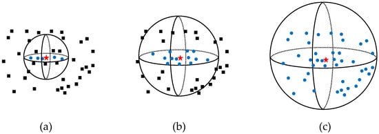 Neighborhoods at different scales. In this representation, the red star is the centroid point of the neighborhood, the blue points are the neighbors within the local neighborhood, and the black points are the outside points of the local neighborhood. In the figure, (a–c) represent different scales.