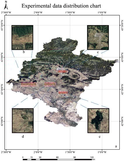 Experimental data distribution chart; (a) overview map of Navarra, background: Google Earth; (b) the mountain area of Sorlada; (c) part of the urban area of Pamplona; (d) part of the suburb area of Berbinzana; (e) Laguna de Pitillas Lake and its vicinity.