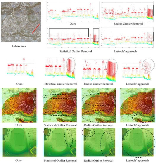 Table 2 reveals that our approach outperformed the existing denoising approaches in both accuracy and F1-score. We also used the original RandLA-Net [61] to train a noise point classifier and conducted comparison experiments. To compare the denoising results of our approach with other existing approaches, we visualized the example of denoising results for urban areas in Figure 6. The figure contains data from nine sample point cloud files, covering a total of 9 km of the urban area. Four figures in the top right-hand corner exhibit local details by profile line figures. The middle four figures display the difference in details of the profile lines after applying different methods of denoising, and the bottom four figures depict the overall denoising results by Digital Surface Model (DSM) for convenient comparison. Our method enabled a more comprehensive and more accurate labeling of noisy points in the point cloud. As shown in the area marked by red dashed lines in the middle row, existing denoising algorithms still reserved a large number of noisy points, and many ground points were filtered out. This means that, as for SPL point clouds, the use of machine learning to fully learn the local features of the point cloud can more accurately identify noisy points, especially in areas with dense buildings and complex category types.