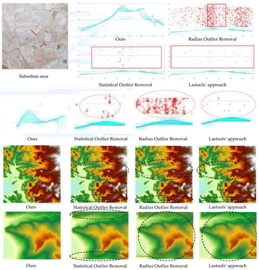 In the suburban area, there were few tall categories, but there was some topographic relief. A comparative experiment was carried out on the point cloud data of the suburban area to compare the denoising effect of our approach with the existing approaches for SPL point clouds data in the suburban area.