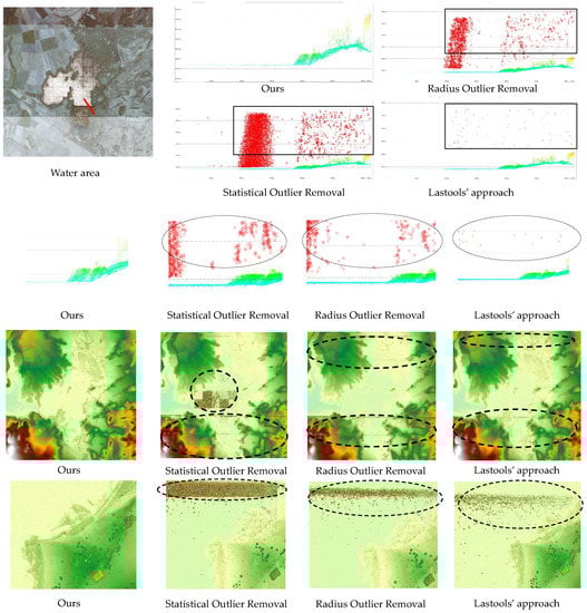 Examples of results in the water area are visualized in Figure 9 to compare our denoising results with those of existing methods. As can be observed from the experimental results, the existing denoising approaches could not identify the noisy points on the water surface well due to their large number and density. Although the proposed denoising approach was also affected by the sparse water surface point cloud data, the overall denoising effect was still better than the existing denoising approaches, since we introduced multiple neighborhood features to jointly train the noisy point classifier. Compared with existing denoising approaches, the proposed approach could extract noisy points more accurately and comprehensively, even on water surfaces with sparse point cloud data, as shown in the profile line figures and the DSM figures (Figure 9).