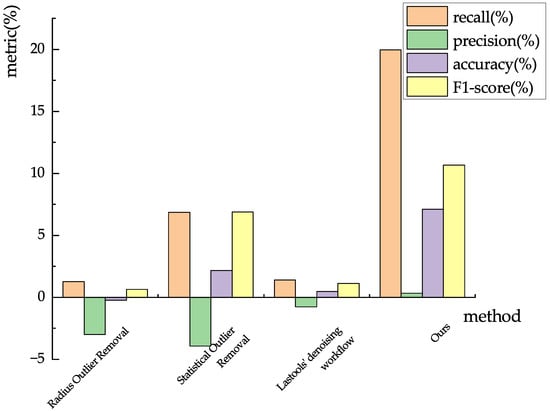 Figure 13 depicts the improvement of the evaluation metrics after the second denoising using different methods. We could see that the improvement in the denoising effect was not obvious after using the existing methods to denoise the SPL point cloud data several times. In contrast, after multiple denoising, the proposed approach improved the denoising effect considerably better than the existing denoising methods.