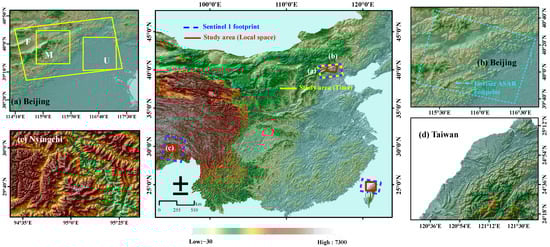 Study area and SAR images used in the experiment of local space and time. The coverage of SAR data is shown by the dotted polygon. The study area is shown by the solid polygon. (a) Topographic map of Beijing for time experiment; F represents the coverage of the interferogram, M represents the mountainous area with complex terrain, and U is the urban area with flat terrain. (b) Topographic map of Beijing for local space experiment. (c) Topographic map of Nyingchi for local space experiment. (d) Topographic map of Taiwan for local space experiment.