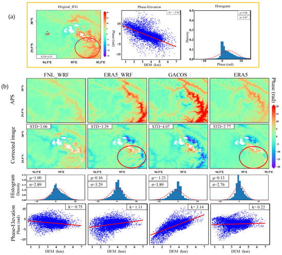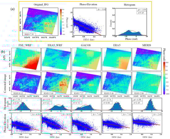 The RMS errors after correction by ERA5-WRF, GACOS, ERA5, and MERIS decreased compared with those of the original interferogram by 26%, 2%, 26%, and 62%, respectively. However, the RMS error corrected by FNL_WRF was increased by 8%. The correction by using MERIS was the best, followed by ERA5-WRF and ERA5, GACOS, and FNL-WRF (Figure 2b, first row).