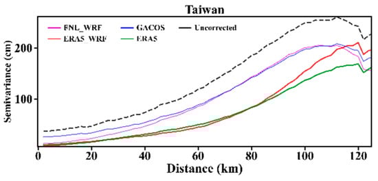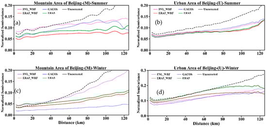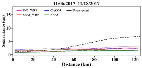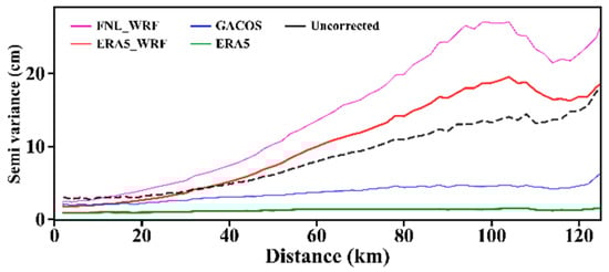 In summer, the variation of tropospheric delay is larger in the 6 h interval. The acquisition time difference between the data sources of the correction method and the SAR image data dominated the corrective effects. Meanwhile, the time downscaling methods had influences on their corrective effects. FNL_WRF and GACOS used FNL and HRES-ECMWF, respectively, at 6:00 and 12:00, as data sources. Therefore, the correlation between the corrected residuals and the elevation, as well as the residual semi-variogram showed similar characteristics. Additionally, neither of them can accurately capture the tropospheric delay at the acquisition time of the SAR image.