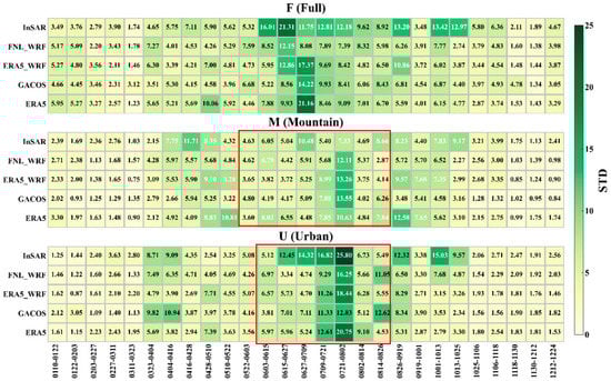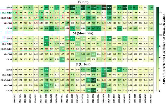 The ERA5 datasets were used to calculate the mean diurnal variation of tropospheric phase delay in July and December for urban (U) and mountainous (M) areas in the case of seasonality effects (Figure 14).