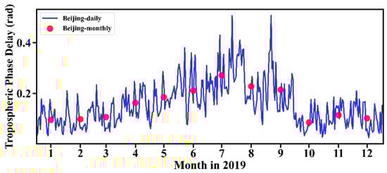 According to atmospheric characteristics, tropospheric delays can be divided into systematic and stochastic components in space and time, represented in space as stratified components and turbulent components, and in time as seasonal and non-seasonal components []. Therefore, the corrective effects of ERA5_WRF were evaluated under the different influences of the tropospheric delay from the perspective of time and space.