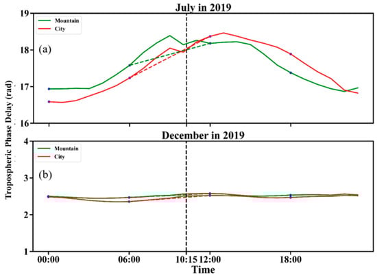 Beijing: (a,b) Mean diurnal variation of tropospheric phase delay in July and December for urban (red line) and mountainous (green line) areas. The dotted line represents the time linear interpolation method of GACOS, and the intersection of the black dotted line with the red and green dotted lines is the time interpolation results of GACOS.