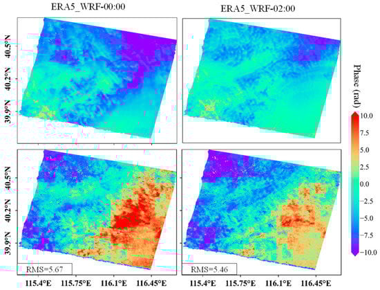 Most of the current data on atmospheric observations are for 00:00, 06:00, 12:00, and 18:00. If the WRF simulation started at these times, more observational data were used in the simulation. FNL_WRF started simulations at these times. To shorten the run time of the simulation, the probability that the ERA5_WRF simulation starts at exactly these time points is low, and fewer observations may lead to lower accuracy. To explore the impact of the run time, the Beijing area in Figure 1b was used as the study area, using ERA5 datasets as the initial field, and applying the same microphysical schemes to start the simulation at 00:00 and 02:00. The results were used for interferogram correction (Figure 15). The results showed that correction by using the WRF simulation starting at 00:00 was worse than that at 2:00. To simulate the tropospheric parameters at the time of acquisition of the SAR images, a longer simulation time may lead to the accumulation of errors such that better simulation results cannot be obtained.
