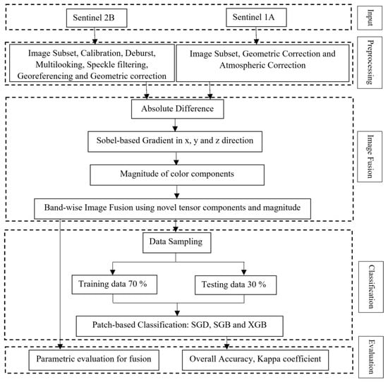 In view of various limitations of the fusion methods and the advantages of SAR and optical data, an algorithm that combines the difference image; gradient image of color components in x, y, and z direction; and the magnitude of the gradients as well as the tensor components to deal with the spatial information is proposed for image fusion. The fusion results were evaluated using various fusion indicators with remote sensing images. Finally, the classification of fused images is performed using SGD, SGB, and XGB Classifier.