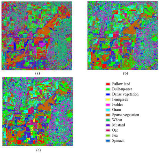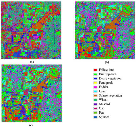 The classified images of fused images i.e., S2 fused with S1 (VH) and S2 fused with S1 (VV) obtained by proposed fusion approach with respective classifiers are shown in Figure 5 and Figure 6.