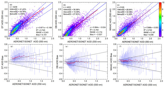 Overall accuracy of (a) DT, (b) DB, (c) MAIAC; the solid red line represents the regression line; the solid blue line represents the 1:1 reference line, and the dashed blue line represents the expected error line. The AOD bias box plot of (d) DT, (e) DB, (f) MAIAC products; each box is based on 100 matched data; the dashed line represents the expected error line, and the red dot represents mean bias.
