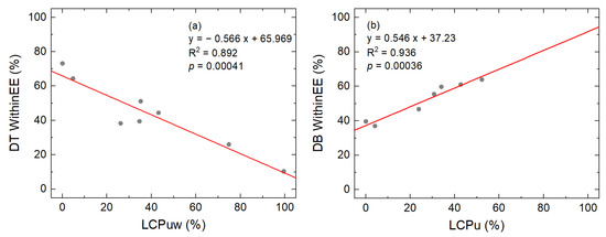 (a) Correlations between land-−cover proportions of urban and water and DT Within EE. (Three sites with the least matched data are removed, which are QDH, HZC, and SX). (b) Correlations between land-cover proportion of urban without water and DB Within EE (QDH, HZC, and SX with fewer matching data and SH with a high urban proportion close to 100% are removed).