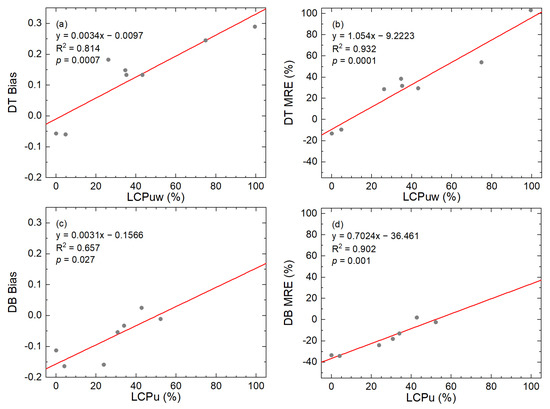 The bias and Mean Relative Error (MRE) (defined by Equation (10)) of DT have an obvious linear relationship with LCPUW (Figure 4a,b), and the R2 values are 0.814 and 0.932, respectively. The bias and MRE of DT are positive, except for at LATM and HZZ, with a very small LCPUW. The bias and MRE of DT increase, and the accuracy decreases with the rise in LCPUW. The bias and MRE of DB have an obvious linear relationship with LCPU (Figure 4c,d). Different from those of DT, the bias and MRE of DB are all negative, except for those for XZ, with a high LCPU. Overall, the bias and MRE of DB increase with the rise in LCPU, and the accuracy improves.