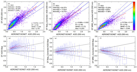Accuracy of (a) DT, (b) DT bias-corrected, (c) DT MRE-corrected AOD; the solid red line represents the regression line; the solid blue line represents the 1:1 reference line, and the blue dashed line represents the expected error line. Bias boxplot of (d) DT, (e) DT bias-corrected, (f) DT MRE-corrected AOD; each box is based on 100 matching data points; the dashed line represents the expected error line, and the red dot represents the mean bias.
