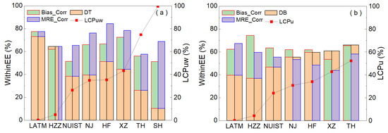 The comparison of the Within EE of DB before and after correction at each site is shown in Figure 6b. The Within EE of the DB-corrected product at LATM, HZZ, and NUIST with low LCPU is significantly improved, but the improvement of Within EE gradually decreases with the rise in LCPU. When the LCPU exceeds 30%, the Within EE of the DB MRE-corrected product becomes lower than that of the uncorrected product, and the bias and MRE-corrected methods lead to a decrease in DB Within EE at HF, XZ, and TH. Therefore, only the DB product with an LCPU less than 30% can be corrected effectively.