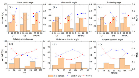 Influence of SZA (a), VZA (b), SA (c), and RAA (d–f) on the accuracy of DT, DB, and MAIAC products. The orange vertical bar represents the proportions of matches in each angle section.