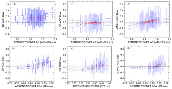 Accuracy of DT, DB, and MAIAC products under different AE (a–c) and SSA (d–f); each box is based on 100 matched data points, the dashed line represents the expected error line, and the red dot represents mean bias.