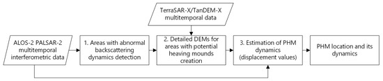 In the first stage (Figure 1), we need to detect a PHM against the background of a multiple chaotic terrain changes of various spatial scales. The difficulty of detecting PHMs with anomalous backscattering dynamics is primarily due to their relatively small size, as well as the intense processes of seasonal thawing/freezing over a large area. We suggest using multi-temporal long-wave L- and P-band SAR backscattering data to decrease the influence of small-scale roughness. More stable winter data should be used for the elimination of seasonal thawing/freezing/watering factors that affect backscattering and severely corrupt the interferometric phase. Due to the relatively slow PHM increase, we cannot use data within one winter season, for example from December to February. So, the best choice is to take data from the same winter months of different years. Now, the only option is L-band ALOS-2 PALSAR-2 radar interferometric data for the winter period with a time baseline of about one year (see Table 1). Herein, we assume that the thickness of the snow cover is the same in different years and does not create an additional phase shift [19].