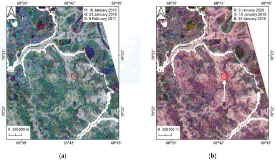 Multi-temporal RGB composites of radar backscattering (dB) at HV polarization: (a) red for 10 January 2019, green for 25 January 2018, blue for 9 February 2017; (b) red for 9 January 2020, green for 10 January 2019, blue for 25 January 2018. Red circle marks the heaving area with a buffer zone.