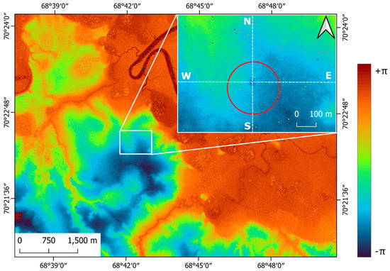 In these images (Figure 3 and [17]), the diameter of the detected anomaly reaches 140 m, which exceeds greatly the average diameter (25 m) of the formed crater [2]. This difference is related to the fact that the area of the surface that was deformed is much greater than the formed crater. Further, it is proposed to perform the analysis only within a 270 m-diameter circle covering the heaving area, with a buffer zone (red circle in Figure 3b).