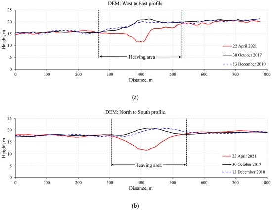 Figure 5a,b shows the elevation profiles extracted from three calculated TerraSAR-X/TanDEM-X DEMs: 13 December 2010 (blue dashes), 30 October 2017 (black solid line), and 22 April 2021 (red solid line). These profiles are presented by white dashed lines in the box in Figure 4: along the west to east line (Figure 5a) and along the north to south one (Figure 5b). The elevation change observed just corresponds to this PHM/crater. Note that, in order to improve the accuracy of satellite interferometric data and DEM coregistration, one should use data obtained with the same geometry of the radar survey. In the studied case, radar satellite data obtained from the ascending and descending orbits were used (Table 2). All three DEMs are presented at the web page [17].