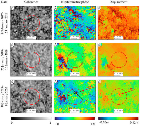 Figure 6 (north-to-south direction, vertical) shows fragments of coherence images, interferograms after filtering, and maps of displacements along the radar line of sight (LOS). As it can be seen from Figure 6, it is difficult to assess deformations within the circular outline according to the 9 February 2017–25 January 2018 pair of images due to low coherence (less than 0.2) and great speckle noise. According to the second annual interval, 25 January 2018–10 January 2019, the coherence over almost the entire contour is more than 0.2, and the flattened interferometric phase is relatively stable. Inside and outside the circular outline, there is an areal uplift along the LOS [17]. Overall, the results obtained according to the 9 February 2017–25 January 2018 and 25 January 2018–10 January 2019 pairs of images are consistent with the results of [6]. The values of deformations within the outlines corresponded to the background dynamics around it these years.