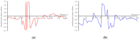Interferometric phase profile for the pair of images from 10 January 2019–9 January 2020: (a)—along the LOS; (b)—across the LOS.