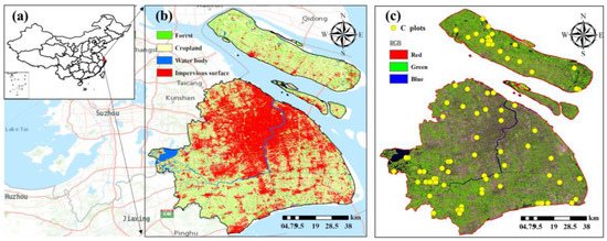 (a) China’s border; (b) classified data of Shanghai in 2019; (c) Landsat 8 image of Shanghai province and forest aboveground carbon (AGC) plots in 2019.