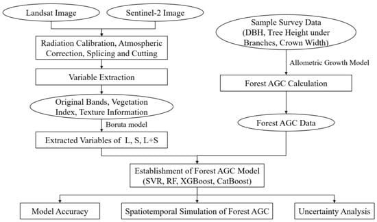 Currently, the methods of estimating forest AGC generally include field surveys, model simulations, and remote sensing inversions. Considering field surveys, the inventorying of sample plots uses two types of survey data (diameter at breast and tree height) to calculate carbon stocks through the anisotropic growth equation. The estimated value obtained, although accurate, requires considerable human and material resources and a lengthy survey period, cannot wholly reflect the spatial distribution pattern of the whole region, and has certain destructive properties [8]. Model simulation methods, such as BIOME-BGC, mainly estimate carbon stocks by simulating physiological–ecological processes such as photosynthesis, respiration, and decomposition in ecosystems [9]. It should be noted that various vegetation parameters are needed to effectively simulate forest carbon stocks; thus, when the available input parameters are inadequate or missing due to acquisition difficulty, the prediction results will be substantially impacted [10]. The remote sensing estimation method mainly establishes a complete mathematical model, and its analytical formula incorporates the information received from satellites and directly measured biomass. Finally, this approach uses an analytical formula to estimate the forest biomass in other areas [11]. Remote sensing data offers the advantages of fast acquisition and high temporal resolutions and can cover large spatial scales [12]. As remote sensing technology continues to rapidly develop, the high-resolution images and multispectral images obtained by various satellites can collect more detailed vegetation information, such as texture features, and be used for vegetation indices [13,14]. Additionally, these datasets can be combined with the growing suite of machine learning methods, such as the random forest algorithm, support vector regression, and deep learning techniques [15]. Therefore, forest carbon stock estimation using remote sensing technology combined with ground survey data is more accurate [16].
