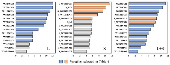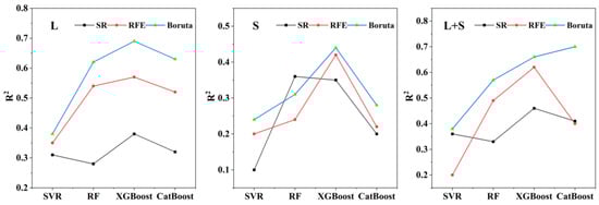 The explanatory power of the selected feature variables for AGC is given in Figure 3, along with a comparison of the three feature variable screening methods, stepwise regression analysis (SR) [57], and recursive feature elimination (RFE) [58]. As seen in Figure 3, the feature variables obtained by the Boruta-based algorithm correlate better with AGC in general, especially for both L and L + S data. Table 4 shows the feature variables screened from the L, S, and L + S data using the Boruta method. Among the three datasets shown in Table 4, texture information has the strongest influence on the AGC. Eleven variables screened in the L dataset are texture information, and among the five feature variables screened in the S dataset, only EVI is not texture information. All variables screened in the L + S dataset are texture information, which consists of 12 variables from the L data and 2 from the S dataset.