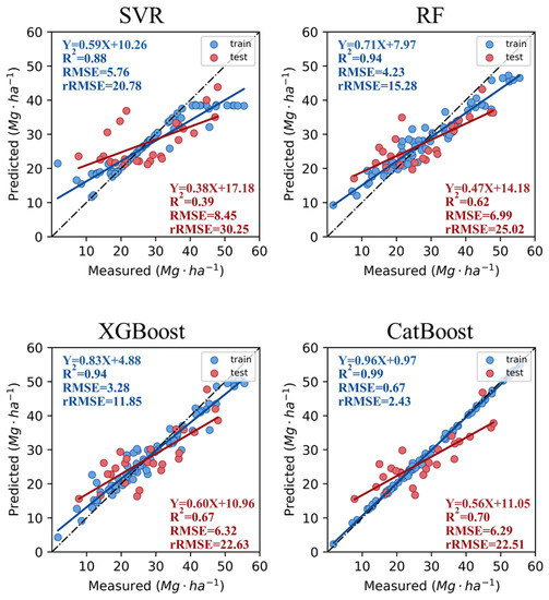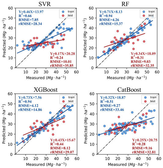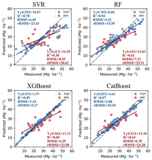 The accuracy evaluation of the AGC models (SVR, RF, XGBoost, and CatBoost) constructed based on Landsat feature variables are shown in Figure 4. The accuracy R2 in the modeling and validation stages ranges from 0.78 to 0.99 and 0.38 to 0.66, respectively. In addition, the RMSE ranges from 1.43 to 6.49 Mg/ha.