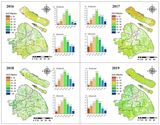 Prediction results of the spatiotemporal distribution of AGC in the Shanghai urban forest from 2016 to 2019.