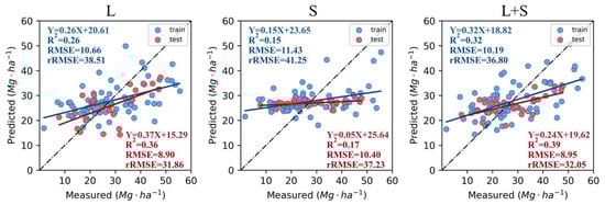 The traditional multiple linear regression (MLR) model is one of the most widely used methods for the remote sensing inversion of forest AGC [59,60,61]. In this study, MLR was also used to construct three data types for the Shanghai urban forest AGC estimation models, L, S, and L + S, as shown in Figure 9. The accuracy R2 values of the MLR models constructed by L, S, and L + S are 0.26, 0.15, and 0.32, respectively, and the validation accuracy R2 values are 0.36, 0.17, and 0.39, with an overall accuracy that is significantly lower than the four machine learning algorithms discussed in Section 4.2. The forest AGC spectral response tends to be nonlinear [62]; therefore, the MLR model cannot better explain the nonlinear characteristics between the independent and dependent variables.
