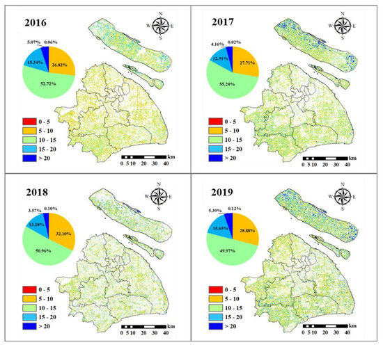 The model accuracy results of the urban forest AGC in Shanghai based on Landsat, Sentinel-2, and L + S data using four models, SVR, RF, XGBoost, and CatBoost, respectively, show that the AGC model based on L + S data using the CatBoost algorithm had the highest accuracy. Therefore, in this study, the prediction of urban forest carbon storage in Shanghai for different periods based on the characteristic variables of L + S using the CatBoost algorithm was carried out to obtain the spatial distribution of urban forest AGC in Shanghai from 2016 to 2019, and the results are shown in Figure 7.