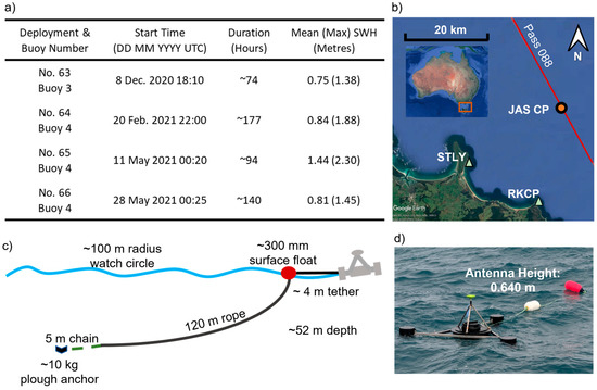 - Zhou, B.; Watson, C.; Legresy, B.; King, M.A.; Beardsley, J.; Deane, A. GNSS/INS-equipped buoys for altimetry validation: Lessons learnt and new directions from the Bass Strait Validation Facility. Remote Sens. 2020, 12, 3001. [Google Scholar] [CrossRef]