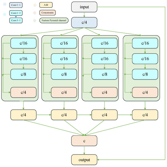 For the feature pyramid channel, we borrow the idea of inception [37,38,39,40]. We replace the 5 × 5 and 7 × 7 convolution kernels with two and three pairs of asymmetric convolutions, respectively. Furthermore, the number of filters of the first to third pairs of asymmetric convolutions is set to C/16, C/16, and C/8, respectively. In this way, multi-scale feature maps with different receptive fields can be constructed with less computational overhead. In order to further reduce the amount of calculation, we share the convolution kernel and extract features from each pair of asymmetric convolutions and then concatenate them together. Finally, a multi-scale feature map with dimension C/4 is obtained. The calculation process of the feature pyramid channel can be expressed as follows: