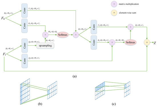 (a) The structure of the CSA module. represents high-resolution features and represents low-resolution features. (b) Schematic diagram of matrix multiplication between and in (a). (c) Schematic diagram of matrix multiplication of with in (a).