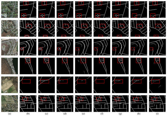 Visualization of segmentation results generated by different methods on the Massachusetts Roads dataset. (a) Original image. (b) Ground truth. (c) CSANet. (d) Deeplabv3. (e) UNet. (f) ENet. (g) CFPNet. (h) SegNet. (i) PSPNet.