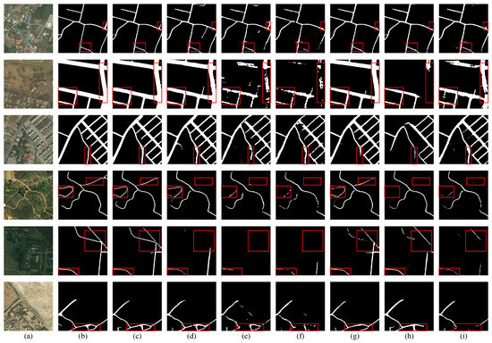 Since the road width in the ground truth of Massachusetts is consistent, it does not match the real scene. Therefore, we used relaxed IoU (IoU) to evaluate the results [41]. The relaxation factor is 4. The Precision, Recall, IoU, Accuracy and F1 score were also used to evaluate the model’s performance.