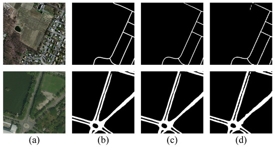 The Massachusetts Roads dataset is provided from V. Mnih’s doctoral dissertation [18]. It is a high-quality aerial road imagery dataset, which includes urban, suburban, rural, and other areas in Massachusetts. The total sampling area is over 2600 square kilometers. The size of each image is 1500 × 1500, and the spatial resolution is 1 m. Its training and test sets contain 1108 and 63 images, respectively. We split the image into small images at equal intervals in order to use a larger batch size to improve training effectiveness. We first upsampled the training set to 1536 × 1536 size by bilinear interpolation and crop them to small images of size 512 × 512 with a stride of 256. In this way, each training image is cropped to obtain 25 small images. At the same time, the occluded images were removed from the dataset to avoid negatively impacting the network training. For the test sets, we crop them into small images of 512 × 512 with a stride of 512. This leaves no overlapping area between each two small cropped images. Each image is divided into nine small images. Finally, the training set and test set consist of 21,951 and 567 images, respectively. The dataset is available from https://www.cs.toronto.edu/~vmnih/data/ (accessed on 23 November 2022).
